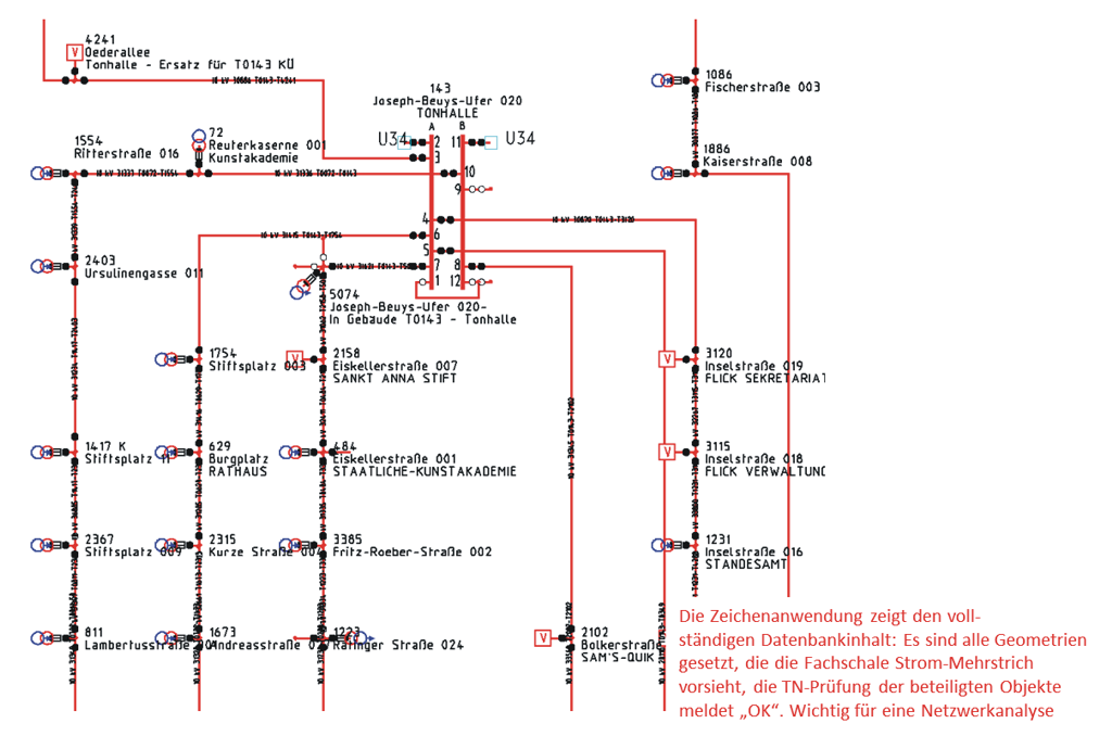 Die Zeichenanwendung zeigt den vollständigen Datenbankinhalt: Es sind alle Geometrien gesetzt, die die Fachschale Strom-Mehrstrich vorsieht, die TN-Prüfung der beteiligten Objekte meldet „OK“. Wichtig für eine Netzwerkanalyse.